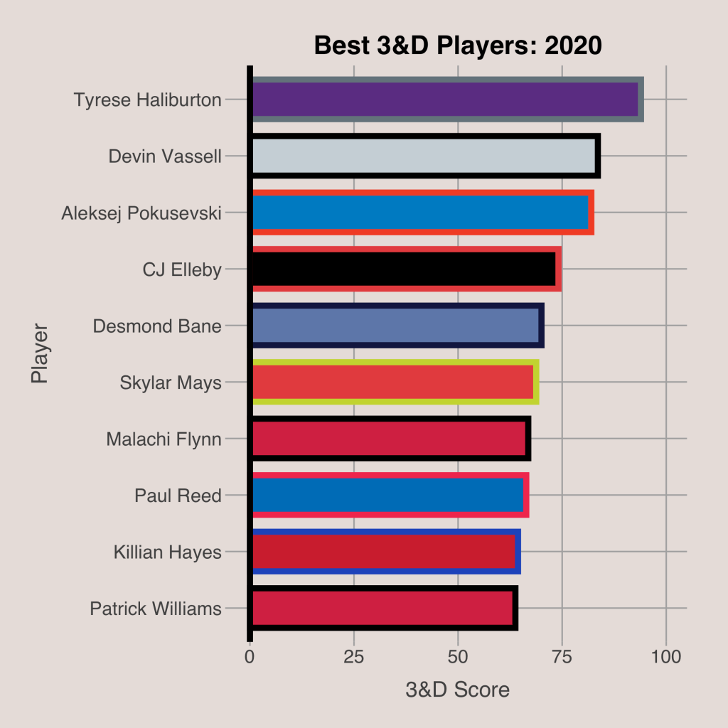 Most of the players who graded highly in the 3 and D Score have fared well in the NBA. Both Mikal Bridges and Reggie Bullock have been good perimeter shooters and defensive players. Donovan Mitchell, Cameron Johnson, and Michael Porter have each shot very well in the NBA, although their defense has not lived up to expectations. Both Matisse Thybulle and Chuma Okeke are great defenders, but need to work on their shooting. Denzel Valentine has been average in both areas through his career. The two major misses were Jordan Adams (although he actually did shoot well and defend well in the NBA) and Jacob Evans, both of whom did not last in the NBA. In addition to the 2011 to 2019 drafts, I also applied the models to the 2020 draft to see who the best two-way player were last year.