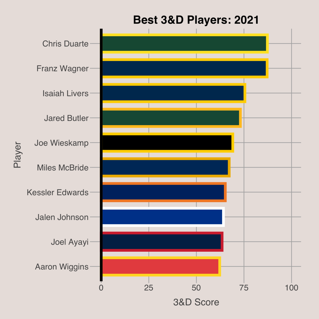 Chris Duarte and Franz Wanger are the best 3 and D options of the 2021 NBA Draft. Both have a high projected 3-point percentage (Duarte = 36.6%; Wagner = 35.9%) and defensive box plus-minus (Duarte = 0.37; Wagner = 0.78). Both players are projected to go in the top 20 of the draft, and for good reason. Any team can use players that can both shoot and defend well. Duarte, age 24, can provide these skills immediately, and is therefore best suited for a contending team. Wagner, on the other hand, is only 19 years old and could improve his shooting and his defense even more to become a premier player in the NBA. I believe that Franz Wagner should be a top 10 pick.