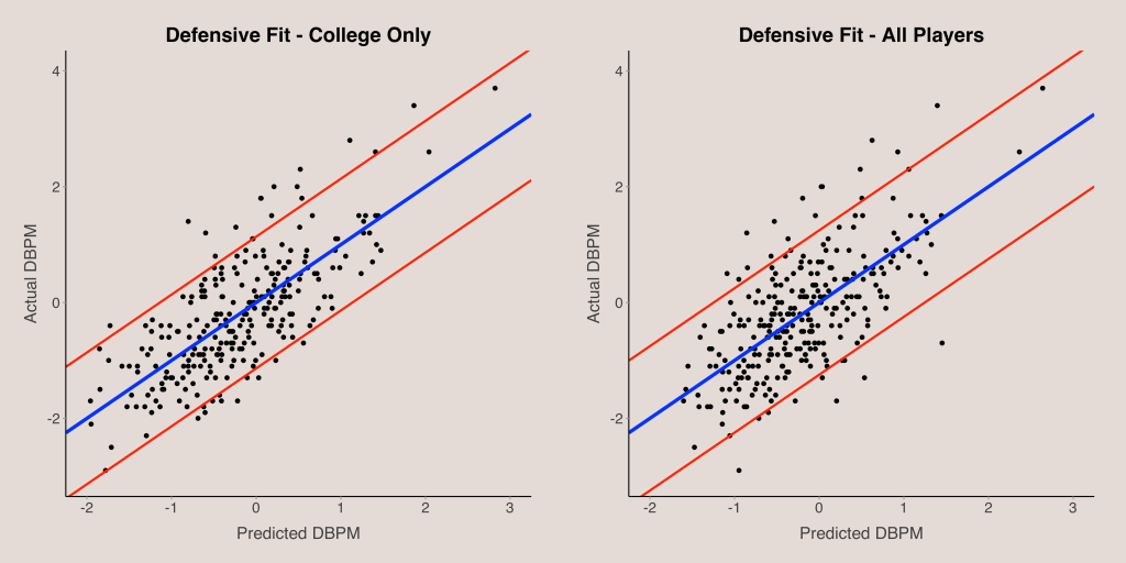 One issue in creating a defensive model was differences in recording statistics between college and international players. For college players, several advanced statistics (like steal percentage, block percentage, individual defensive rating, and defensive box plus minus) were readily available for their collegiate years. However, players that played internationally prior to the draft did not have these statistics included in the places that I retrieved the data (Tankathon.com and College Basketball Reference). They did have simple statistics, like rebounds, steals, and blocks, though. Therefore, I ran two separate regression models: one included a sample of only college players, whereas the other included a sample of both college and international players. The model of only college players included advanced statistics, while the model using both college and international players could only incorporate simpler statistics.