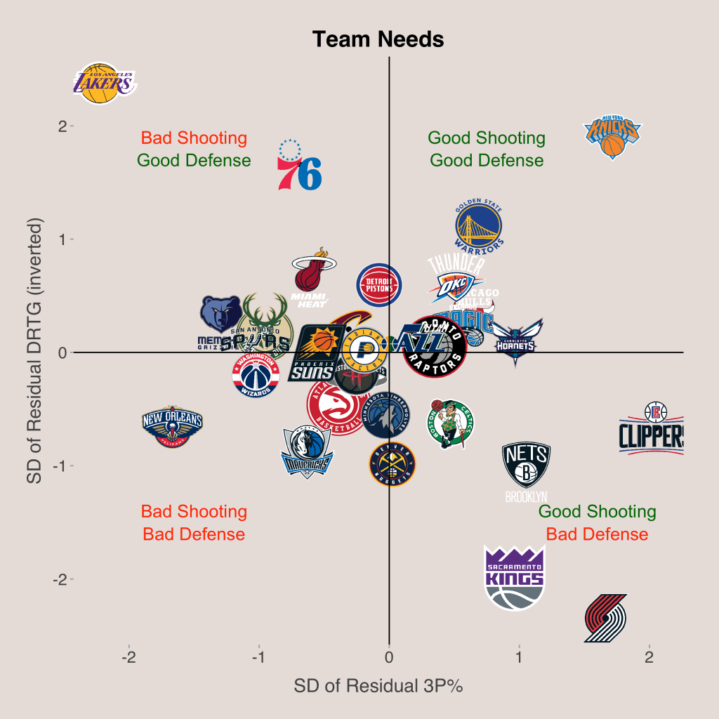 Two graphs showing team needs are displayed below. The first uses four quadrants, where the placement of a team in a certain quadrant tells if they need shooting, defense, both, or neither6. The second graph plots net rating on the horizontal axis and relative need on the vertical axis. Therefore, teams towards the right on the second graph are better than teams towards the left, and teams towards the top need more defense whereas needs towards the bottom need more shooting7.