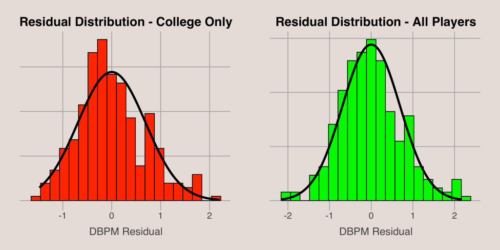 The graphs shown above further analyze the results from the defensive regressions. The residuals of the college only regression were slightly right skewed, while the residuals from the second regression look to be more approximately Normal. Additionally, the standard deviation of the residuals is 0.69 in the college only model and 0.76 in the model including all players. Therefore, a 90% confidence interval in predictions for the college only model would be the expected value from the regression +- 1.13. In the model of all players the confidence interval be the prediction +- 1.25.