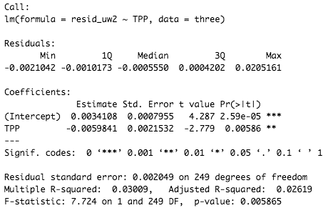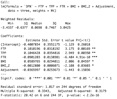 As seen by the regression output above, college three point percentage was a significant predictor of the squared residual of the unweighted model. Therefore, I decided to use a weighted least squares regression as opposed to the ordinary least squares regression. In the weighted regression, the weights were the reciprocal of the predicted squared residual based on the regression above.