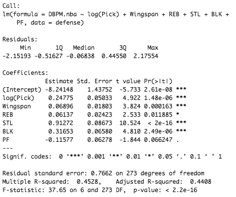 First, I will explain the college only model. The independent variables in this model were the natural log of draft pick, wingspan (in inches), rebounds per 36 minutes (REB), steal percentage (STLP), the natural log of block percentage (BLKP), personal fouls per 36 minutes (PF), individual defensive rating (DRTG), and defensive box plus-minus in college (DBPM.col). The final results of the regression model are displayed below.