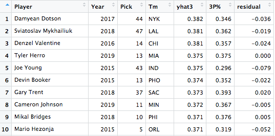 Now that we have a model for predicting 3-point percentage in the NBA, we can see how it performed on past players. The players in the sample with the largest predicted NBA 3-point percentage are shown below.