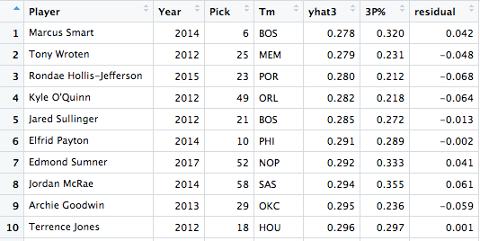 The lowest projected NBA 3-point percentages in the sample are shown above. Marcus Smart and Tony Wroten had the lowest projected 3-point percentages. We can see that the model does a good job in distinguishing good shooters from bad ones as the players with a low projected 3-point percentage often did have low percentages in the NBA. Only 3 of the 10 lowest projections had an NBA 3-point percentage above 30%.