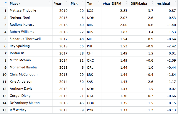 For the final predictions by the model, I used a combination of the two regression models estimated earlier. For players that played in college prior to being drafted, I applied the college only model using advanced statistics, whereas I applied the all player model using no advanced stats for those who played internationally. The best predicted NBA defensive box plus-minuses are shown below.