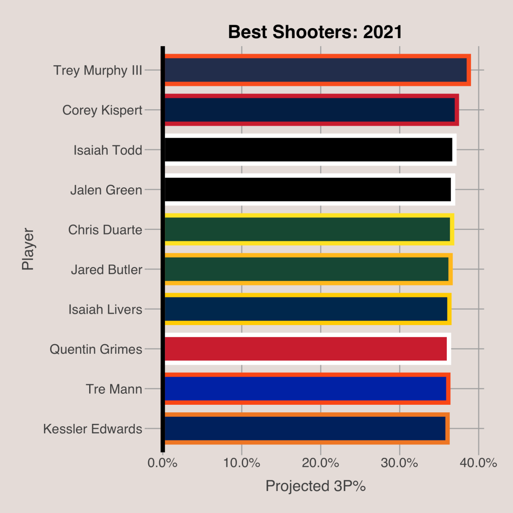 The best projected three-point shooters in the 2021 draft are Trey Murphy III (38.8%), Corey Kispert (37.2%), Isaiah Todd (36.9%), Jalen Green (36.8%), and Chris Duarte (36.6%). Keep in mind that these predictions have a standard error of 5.8% when using a 90% confidence interval. Furthermore, these predictions may be underestimates because league-wide 3-point shooting efficiency has been increasing. Nevertheless, Trey Murphy III of Virginia looks to be the best option for teams looking for perimeter shooting. With an ESPN rank of 18, a 43% three-point percentage, and 95% free throw percentage, Murphy should be ranked higher than 18th, in my opinion. Other mid first round shooting options in addition to Trey Murphy include Corey Kispert, Chris Duarte, and Jared Butler. Jalen Green, the projected number 2 pick to the Rockets, is likely to be a good shooter in the NBA as he shot 36% from 3 and 84% on free throws with a low free throw rate in the G-league. Some potential second round players that project to be good shooters include Isaiah Todd, Isaiah Livers, Quentin Grimes, Tre Mann, and Kessler Edwards. On the other hand, players that may not develop into good shooters despite taking many college 3-point attempts include Daishen Nix, Luka Garza, Sharife Cooper, Kai Jones, and Keon Johnson.