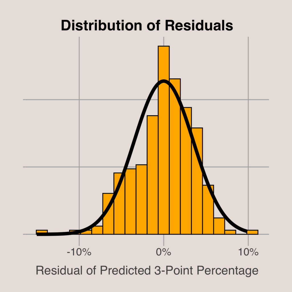 The next step was to test for heteroskedasticity. It was possible that the variance of the residuals were correlated with an independent variable, so I ran a Breush-Pagan test for heteroskedasticity. The p-value of this test was 0.034, meaning that there was statistically significant heteroskedasticity in the model. The variance of the error terms correlated with college three point percentage the most. In this model, players with a lower three point percentage had a greater variance in predicted NBA three point percentage, while players with a greater percentage had a smaller variance.