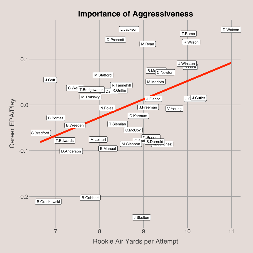 In addition to completion percentage, I added intended air yards per pass attempt as another independent variable to the regression. Intended air yards per attempt is the same as average depth of target. The average depth of target (aDOT) of a quarterback tells us how far, on average, he throws the ball downfield. From the scatterplot below, we can see that more aggressive quarterbacks, those with a greater aDOT, tend to have better careers.