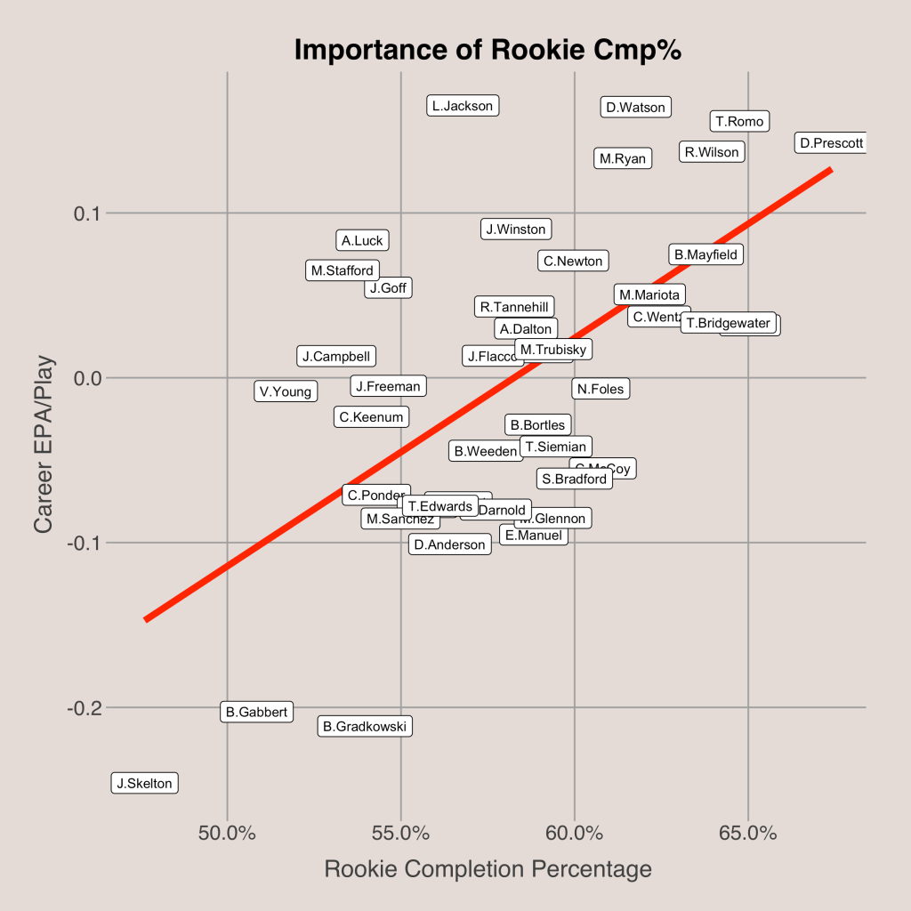 The first variable I included in the multiple linear regression was rookie completion percentage. Rookie completion percentage had a greater correlation to career EPA per play than rookie yards per attempt, touchdown rate, or interception rate. The correlation between rookie completion percentage and career EPA per play was 0.596, indicating a moderate positive relationship. Another interesting result was that rookie and career completion percentage (r = 0.702) had a higher correlation than rookie and career EPA per play (r = 0.679). For these reasons, I chose to use completion percentage as an indicator for passing ability, even though the statistic obviously has its shortcomings.