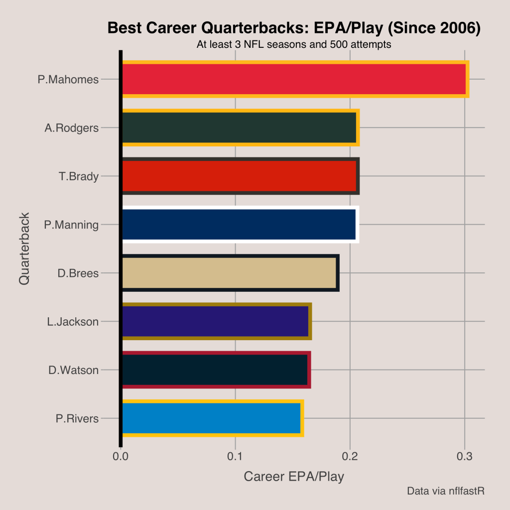 In order to quantify quarterback performance, I had to select a statistic I would use to rank quarterbacks. While passer rating is helpful and simple, it has many flaws, like giving all plays the same weight. Therefore, I opted to use expected points added (EPA) per play to rank the quarterbacks.