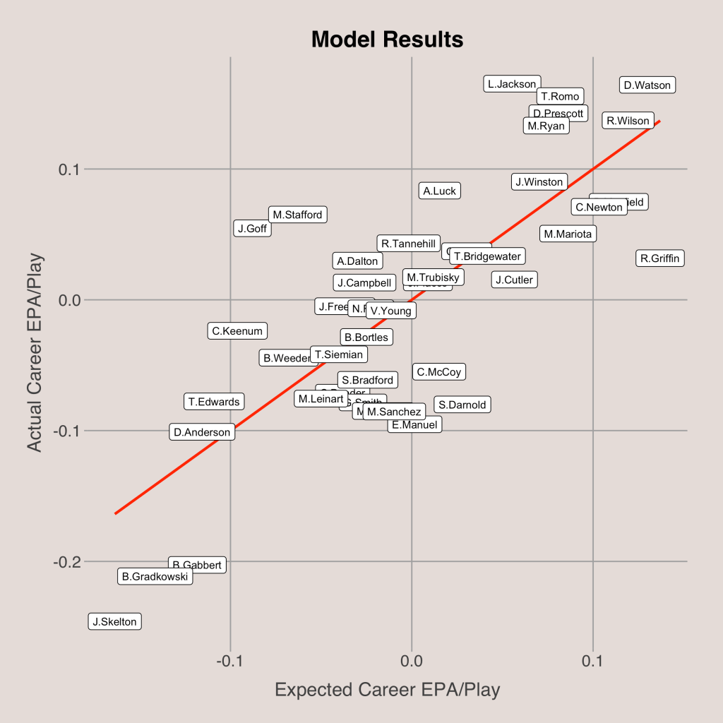 The initial sample of players I used included all quarterbacks that were drafted (or went undrafted) in 2006 or later that had at least 100 passes in their first season of play. This sample was then filtered to only include players with at least 500 NFL pass attempts and 3 NFL seasons. I chose to use players drafted after 2005 because air yards, a metric that I will use in the final model, was first available in the 2006 season. The filters set on the sample of quarterbacks ensured that each player had an adequate sample of plays in both their first-year seasons and their careers. In total, the sample consisted of 43 players.