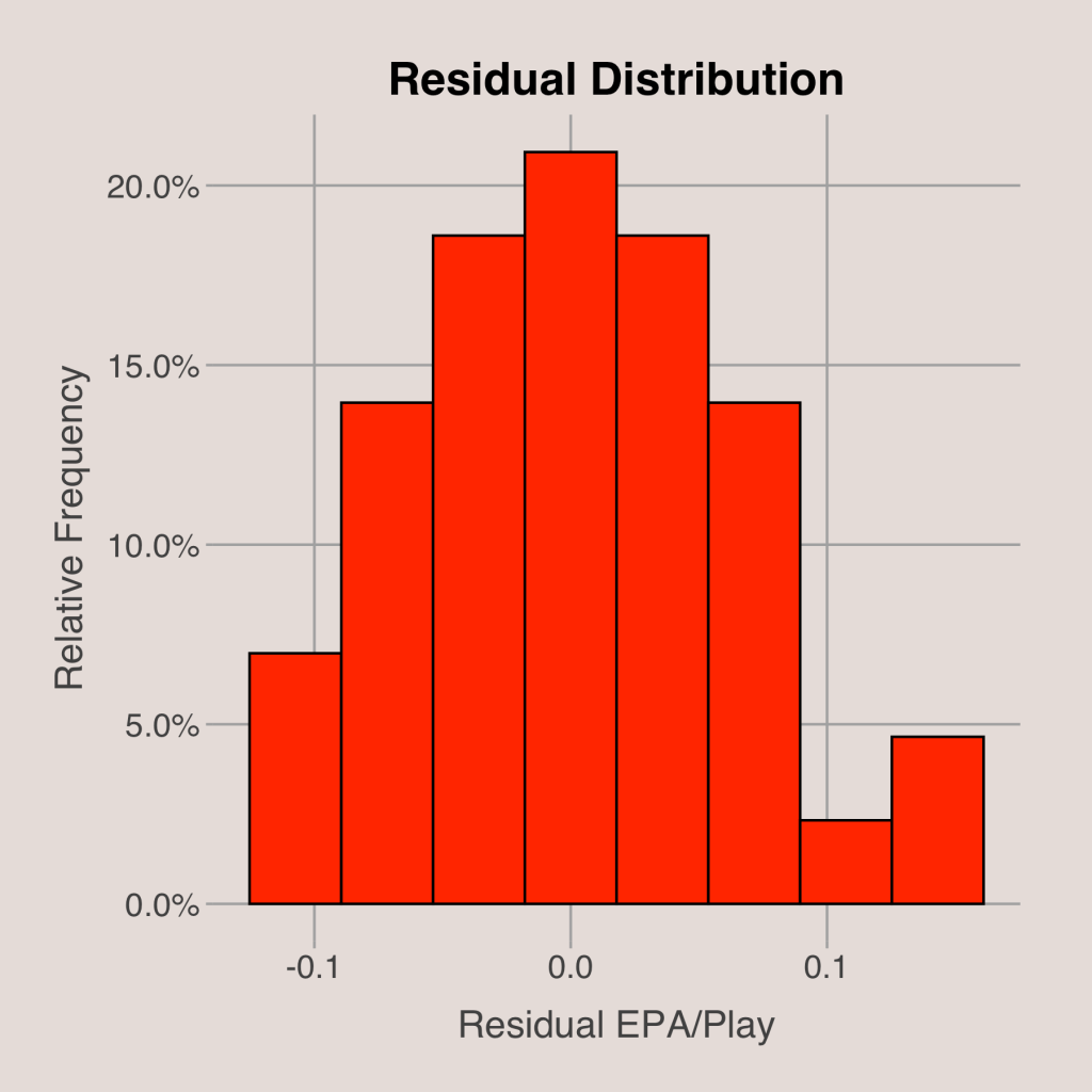 The most significant result was completion percentage, which was significant at all conventional significance levels. As for the other variables, average depth of target and draft pick can be considered statistically significant, while rush percentage was close but not quite. Still, adding rush percentage gave a greater adjusted r-squared, which was ultimately 0.554. The distribution of the residuals looked close to Normal, although there was a slight right skew. The standard deviation of the residuals was 0.0620.