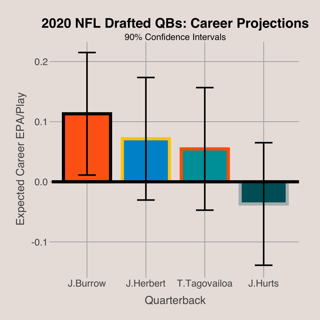 Draft pick and rush percentage are the other two variables in the equation. Joe Burrow was the 1st pick, Tagovailoa the 5th, Herbert the 6th, and Hurts the 53rd. Hurts was the most mobile, with a rush percentage of 25.6%, followed by Tagovailoa (11.0%), then Herbert (8.5%), then Burrow (8.4%). After applying the model to each of these players, the best predicted quarterback was Joe Burrow, with an expected career EPA/Play of 0.113. The confidence interval was found using the standard deviation of the residuals from the model, so the 90% margin of error was 0.102 for each player.