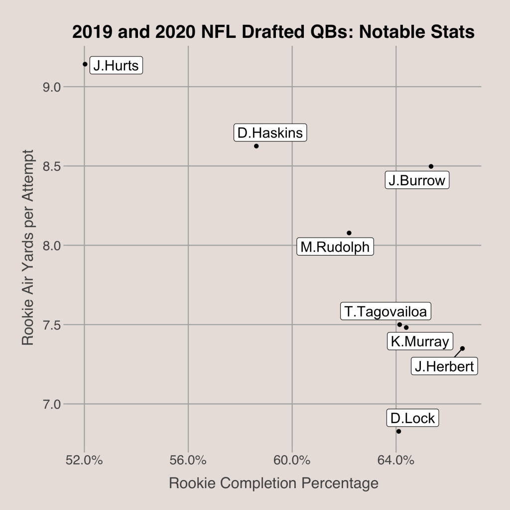 From the scatterplot, there is an obvious negative association between air yards per attempt and completion percentage. However, the player who stood out most was Joe Burrow. Burrow had a completion percentage of 65.3% and an average depth of target of 8.5 yards, meaning he accurate while still being aggressive. Justin Herbert, who had the best completion percentage of the players shown above, had an average depth of target more than a full yard less than Joe Burrow. In fact, Herbert’s average aDOT was the least of the 2020 quarterbacks drafted in the first two rounds. Meanwhile, Tua Tagovailoa had a good completion percentage with a low aDOT, while Jalen Hurts had a very, very low completion percentage with a very high aDOT.