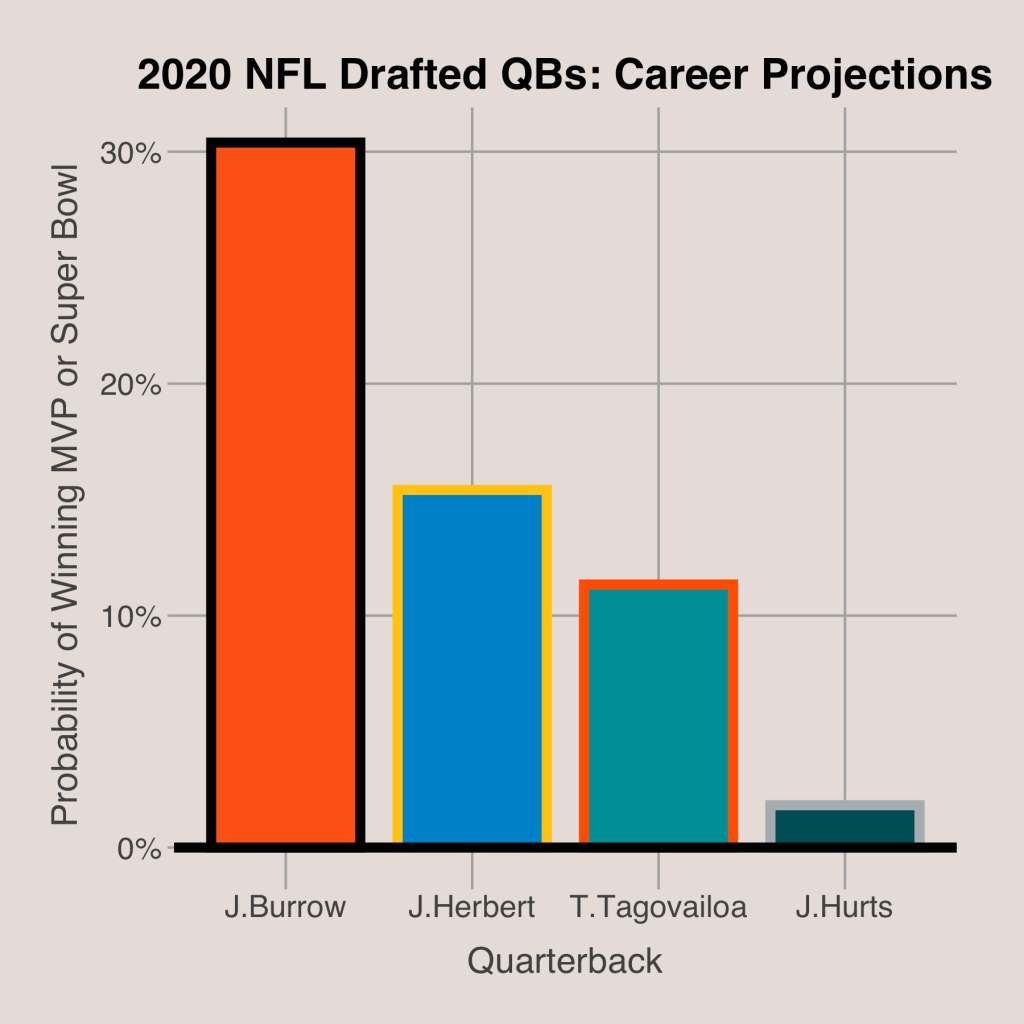 Another step I took was to calculate the probability of each player either winning an MVP award or winning a Super Bowl as the starting quarterback. I did this with a logit model where the independent variable was career quarterback EPA/Play, then I substituted the values for the 2020 drafted quarterbacks. The results are shown below.