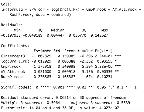 After determining the variables, I ran the final regression. The results are displayed below. The dependent variable was career EPA per play (EPA.car), while the independent variables were the natural log of draft pick (log(Draft_Pk)), rookie completion percentage (CmpP.rook), rookie average depth of target (AY_Att.rook), and rookie rush percentage (RushP.rook). Note that in the regression, the percentages were converted into decimals (so 40.2% would be entered as 0.402).