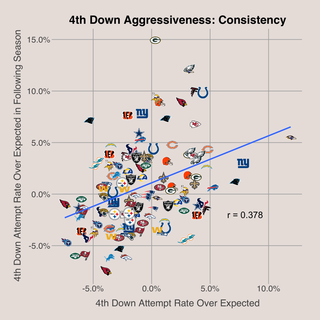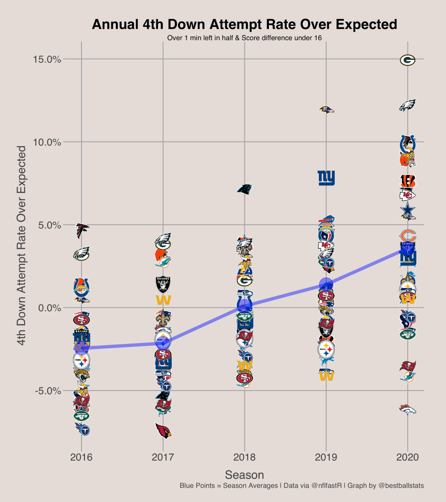 A quick look at the graph below gives some evidence that 4th down aggressiveness correlates with team success. For example, the 2020 Packers, 2019 Ravens, 2017 Eagles, and 2016 Falcons each made it to the divisional round or further after leading the league in 4th Down Attempt Rate Over Expected in their regular seasons.