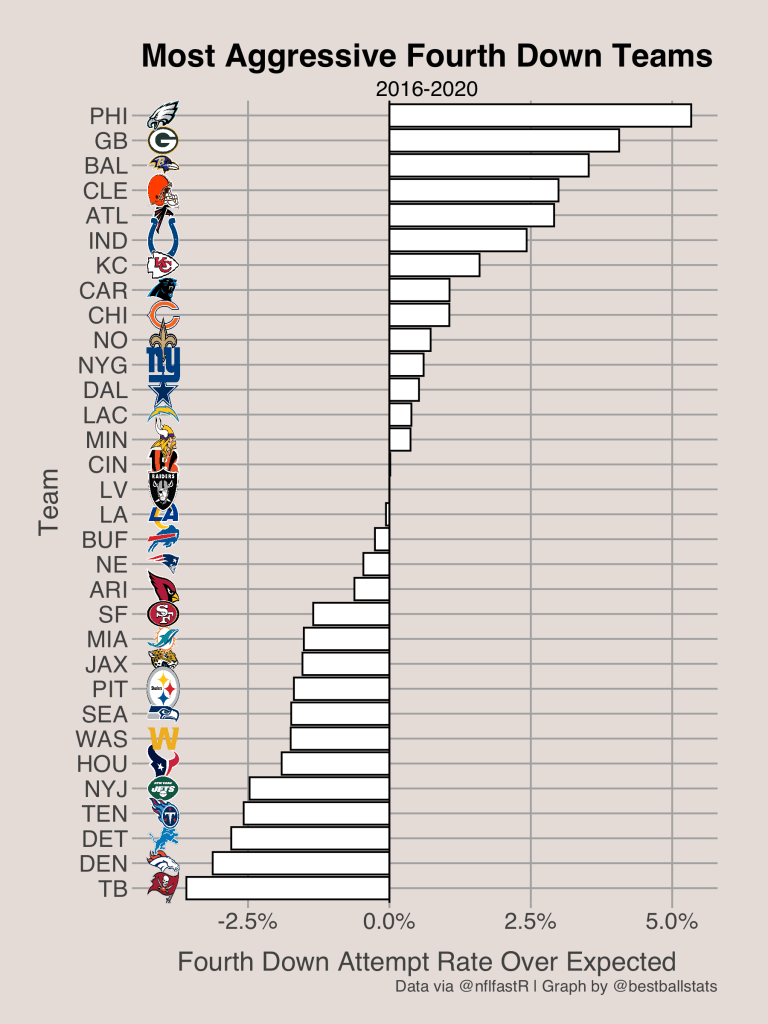 The graph below shows the most aggressive teams on fourth down from 2016 to 2020 combined. The most aggressive 4th down teams have been the Eagles, Packers, and Ravens, while the least aggressive have been the Buccaneers, Broncos, and Lions.