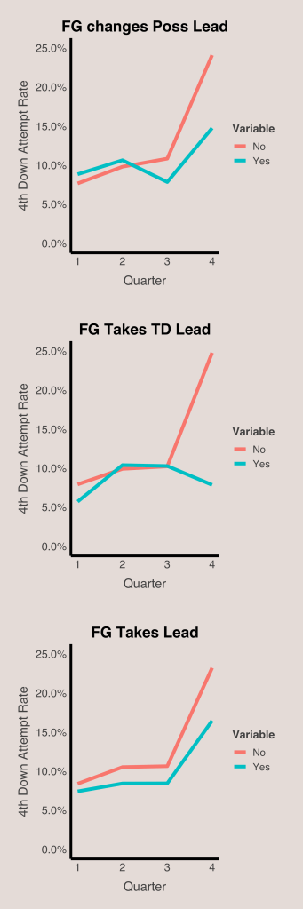 All the variable in the regression are significant, and the coefficients of the dummy variables and interaction terms are as expected. The interaction terms show that when there is a specific advantage to kicking a field goal instead of attempting a 4th down, teams will likely kick the field goal. These effects are far more present in the 4th quarter, though, as shown by the graphs below.