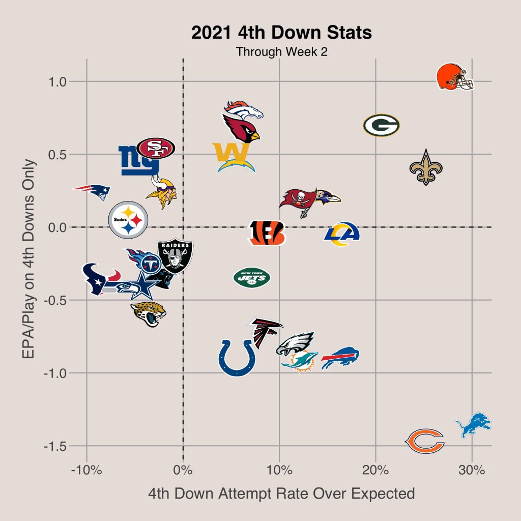 Now that we are a couple of weeks into the NFL season we can look at the aggressiveness of teams this year on 4th down. The most aggressive have been the Browns (who have historically been aggressive) and the Lions (Dan Campbell seems to be changing the culture since the Lions have historically been conservative on 4th downs). Although it is a small sample size, we already are seeing trends in 4th down decision-making, and these tendencies could change the offensive efficiency of a team.
