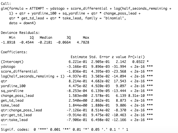 To estimate the probability of going for a fourth down, I ran a logit model, with the results shown below, to predict a fourth down attempt based on the variables listed above in addition to some interaction terms using the dummy variables.