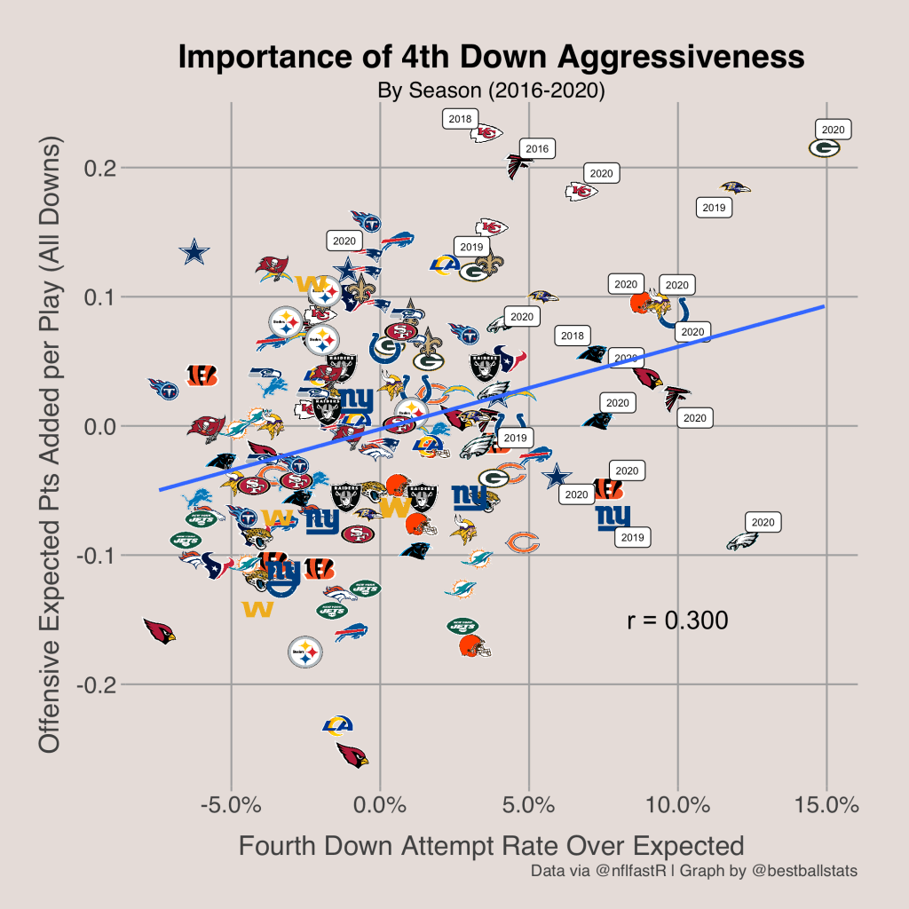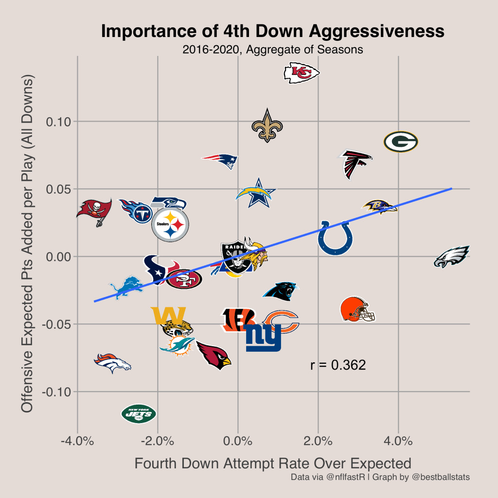 Now that we know which teams are the most aggressive on 4th downs, we can see how that aggressiveness relates to offensive efficiency.