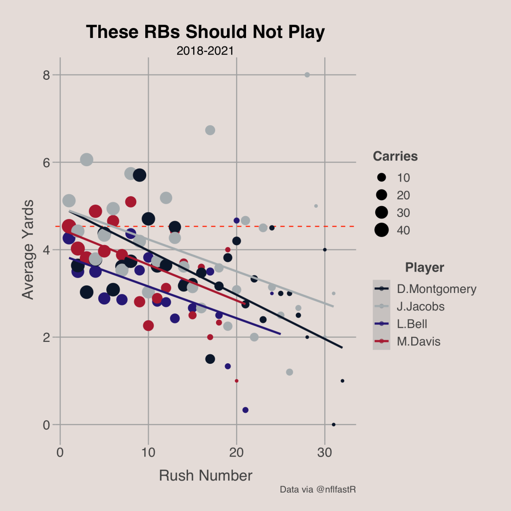 The worst running backs are Le’Veon Bell, Mike Davis, David Montgomery, and Josh Jacobs. Each of these players average only about 4 yards per carry and get worse with more usage. As seen from the graph below, each of these players are above average NFL rushing efficiency for their first 5 carries at most (where their line crosses the dotted red line for the average).