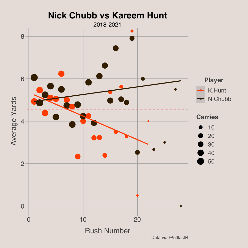 Another useful way to utilize the relationship between rush number and efficiency for each running back is to compare running backs on the same team to see how teams should use their players. For example, we can explore how Nick Chubb and Kareem Hunt of the Cleveland Browns perform as their usage increases. From the graph below, we can see that Chubb gets better further in the game, while Hunt is only efficient for his first few carries. Therefore, the Browns should elect to use Hunt more often for rushing plays earlier in the game, then lean on Nick Chubb more heavily later in the game.