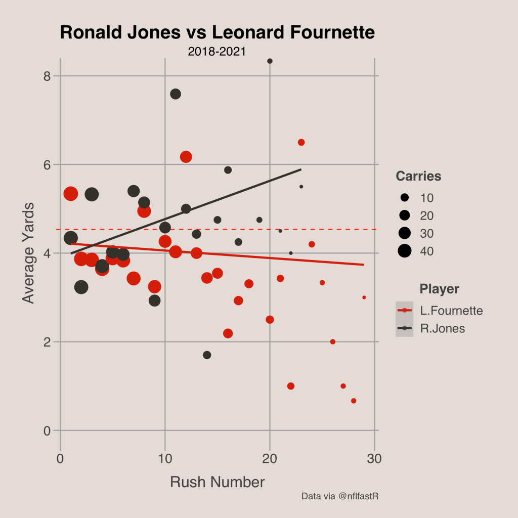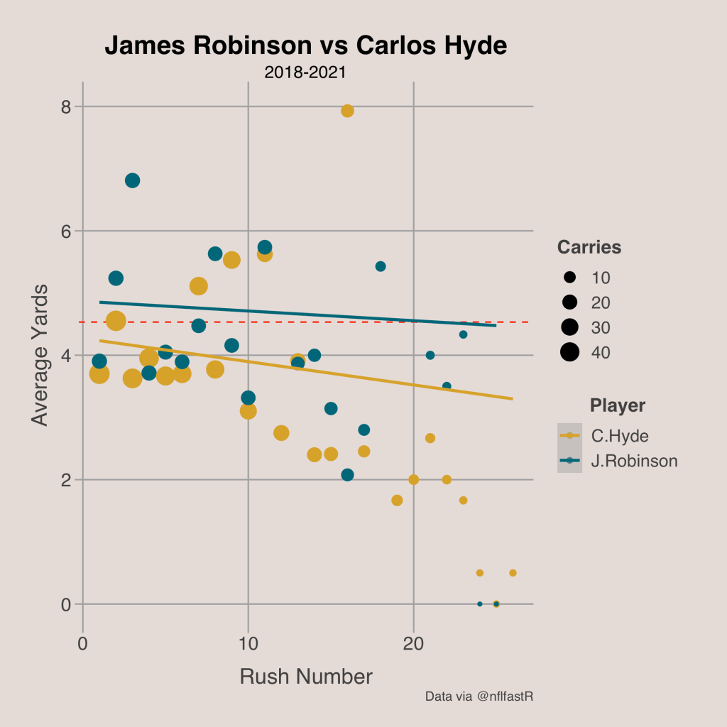We can look at similar scenarios for other teams such as the Buccaneers and Jaguars. For the Buccaneers, Ronald Jones actually gets far better with more attempts while Leonard Fournette’s efficiency decreases slightly, so they should use Fournette earlier in the game and use Jones more often in the latter parts of a game. For the Jaguars, James Robinson is actually more efficient than Carlos Hyde no matter how many rush attempts he has, so the Jaguars really should try to use Robinson as much as possible and they should only use Hyde briefly.