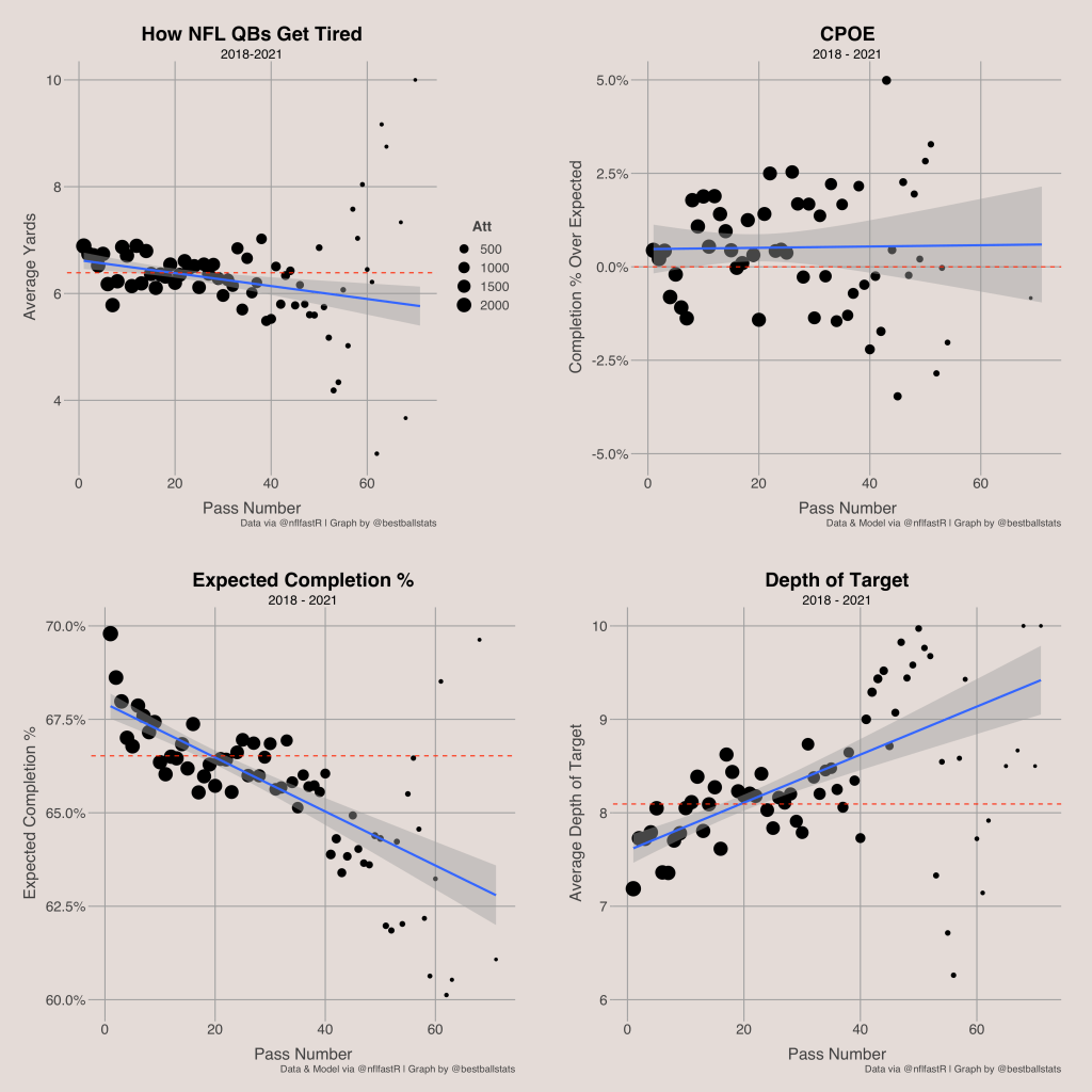 In general, football players get more tired as a game progresses. This is seen by both quarterbacks and running backs at first glance. The average yards per pass attempt for quarterbacks seems to fall as the quarterback’s pass number in a game rises. However, after further investigation, this falls is caused by increased aggressiveness as the completion percentage over expected remains the same throughout the game for quarterbacks while their average depth of target increases, on average.