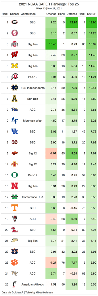 Using my SAFER rankings and strength of record, I also looked at the results from the 2020 college football season. The SAFER rankings are less accurate as a result of scheduling abnormalities due to COVID-19, and the number of games played was not accounted for because I used win percentage in my strength of record, not total wins. The top 25 of the SAFER rankings for 2020 are shown below.