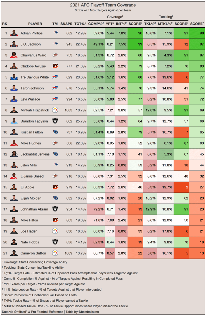 In terms of pure coverage ability, JC Jackson leads the way for the AFC. Quarterbacks complete less than half of their pass attempts when he is targeted, and he also has 8 interceptions. Winning his matchup against Stefon Diggs in the Patriots’ wildcard game against the Bills will be critical for the Patriots’ chances of winning. However, the Patriots are also facing a Bills team that is strong in the secondary. All-Pro cornerback Tre’Davious White may be injured for the Bills, but Taron Johnson and Levi Wallace have kept the Bills secondary at a high level. Meanwhile, the Raiders have the weakest secondary. Brandon Facyson is a good defensive back, but both Johnathan Abram (who is injured) and Nate Hobbs have struggled when targeted, allowing about an 80% completion percentage each. Casey Heyward, who is not pictured in the table above, has about a 60% completion percentage against (better than Abram and Hobbs) but allows 7.6 yards per target (worse than Abram and Hobbs). The Raiders’ secondary will be tasked with covering the Bengals’ talented receiving corps, including Ja’Marr Chase and Tee Higgins on the outside with Tyler Boyd in the slot. If the Raiders’ defensive backs don’t perform better than their season averages, they are in big trouble against the Bengals pass offense.