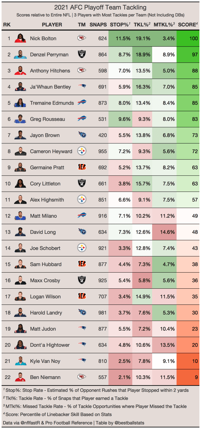 The best run stoppers in the AFC Playoffs are Nick Bolton, Gregory Rousseau, and Tremaine Edmonds. Nick Bolton, the Chiefs leading tackler, actually leads the AFC in all three categories. He records a tackle once in every 5 snaps, on average, and has missed just 4 tackles on the entire year. The Chiefs and Bills have the best tackling players in the AFC, but the Patriots have the worst. Outside of Ja’Whaun Bentley, all of their leading tacklers miss a lot of tackles and don’t stop the run often.