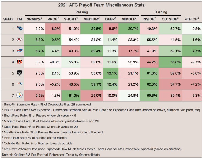 Despite the imperfections of advanced stats, we can determine some key matchups, strengths, and weaknesses using them. In the AFC Playoffs, Patrick Mahomes, Josh Allen, and Joe Burrow are a tier above the rest of the quarterbacks, and Aaron Rodgers and Kyler Murray lead the NFC. The Titans would benefit a lot from Derrick Henry’s return as he averages almost 0.10 EPA/Rush more than D’Onta Foreman. The Bengals have an explosive wide receiving corps, although leading receiver Ja’Marr Chase is prone to drops. The Steelers may be the weakest team in many categories, but they do have one of the best defensive lines, led by TJ Watt. The Bills-Patriots wildcard game will be difficult for the quarterbacks, as they have two of the best secondaries. However, the Raiders’ weak coverage may be an issue against the Bengals. And when it comes to a key fourth down, Sean McDermott (Bills HC) and Kliff Kingsbury (Cardinals HC) are more likely to go for it whereas Bill Belichick and Bruce Arians will opt to kick.