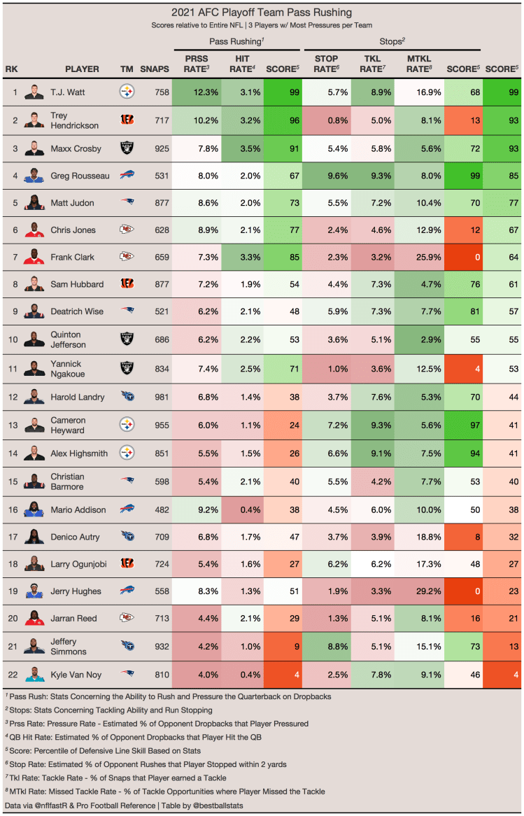 While the Steelers may be the weakest team of this year’s playoffs in many categories, one of their strengths is rushing the quarterback. TJ Watt, who tied the NFL sack record this year, leads the NFL by pressuring the quarterback on about 1 in 8 dropbacks. He is joined by Cameron Heyward and Alex Highsmith, both of whom post respectable pressure rates in addition to very good tackling stats. The Steelers have great defensive linemen, but the Bills actually lead the NFL in overall defensive pressure rate (30.8%). They have 3 linemen with high pressure rates, including rookie Gregory Rousseau. On the other hand, the Titans have struggled to pressure the quarterback this season. They are the only AFC playoff team without a player with a pressure rate of at least 7%, so their Divisional round opponent will not have to worry about having a quarterback under duress.