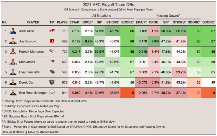 In the AFC, there is a clear top tier of quarterbacks: Josh Allen, Joe Burrow, and Patrick Mahomes. Each of them are efficient and consistent in non-passing and passing down situations. Burrow has the highest completion percentage over expected, meaning that he excels at being accurate. On the other end, Ben Roethlisberger is ranked last among the AFC Playoff quarterbacks in almost every metric. The most aggressive quarterback in the AFC seems to be Josh Allen, as he throws past the first down marker on over 45% of passes. Derek Carr is just about average with a score of 56 out of 100, but he gets worse when put in clear passing scenarios with his EPA/Play falling by 0.118 and his CPOE falling by 1.9%. Therefore, the Bengals, the Raiders’ wildcard opponent, should emphasize forcing passing down situations by stopping early down runs and short passes.