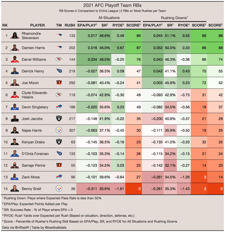 The running backs in the AFC are led by the duo of Rhamondre Stevenson and Damien Harris, both of whom are efficient in all categories. A significant portion of their success likely comes from their offensive line because both of the top RBs are from the Patriots. The Chiefs should lean on Darrel Williams more heavily than former first-round pick Clyde Edwards-Helaire since Williams is more efficient in every statistic. Derrick Henry and Joe Mixon are better on rushing downs, while Clyde Edwards-Helaire and Devin Singletary are better when defenses are expecting a pass. The Titans would greatly benefit from a potential return for Derrick Henry, as Henry’s EPA/Rush is almost 0.08 points better than backup D’Onta Foreman. Lastly, the Steelers should use Benny Snell sparingly as he is the least efficient qualifying running back in the NFL.