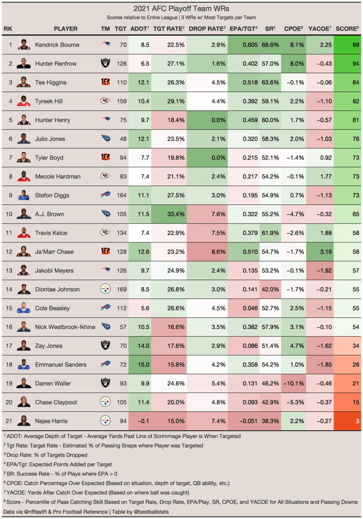 Although not thought of as the best wide receiver, Kendrick Bourne has gone under the radar this season. He has the highest EPA/Target, Success Rate, and CPOE of all the wide receivers in the AFC Playoffs. He has caught almost 80% of passes thrown to him despite not being a checkdown option. The most targeted players include AJ Brown, Tyreek Hill, and Hunter Renfrow. Ryan Tannehill, Patrick Mahomes, and Derek Carr, respectively, depend of these receivers because of their skills to get open and be explosive. Ja’Marr Chase is a boom or bust player: he has a high EPA/Target and is great at gaining yards after the catch, but he has one of the highest drop rates in the NFL. The worst qualifying receiver has been Najee Harris, who is primarily used as a checkdown option for Ben Roethlisberger.