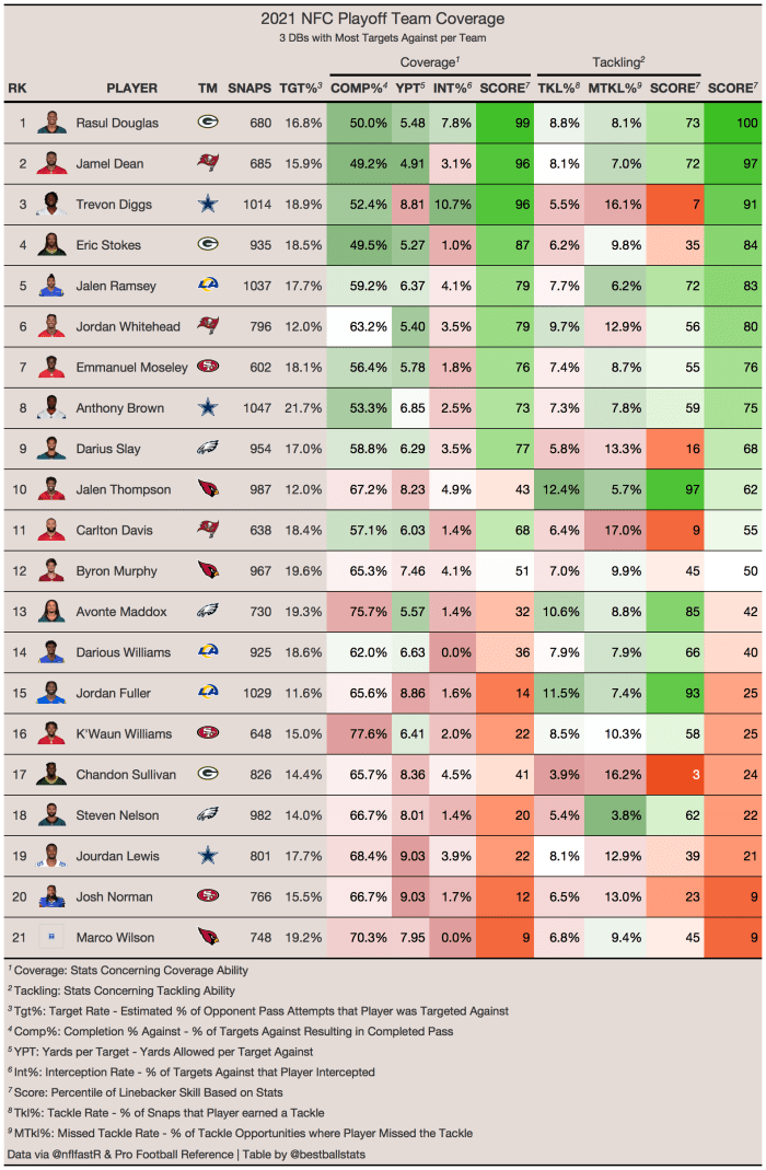The player with the most interceptions on the year is Trevon Diggs, who has picked off opposing quarterbacks 11 times. Diggs is obviously a very good cornerback, allowing just a 52% completion rate and picking off over 10% of targets against him. However, when he allows completions, they are most often big plays. Trevon Diggs has an average yards per target of 8.8 despite his low completion percentage allowed, meaning that passes completed against him go for an average of 16.8 yards. Diggs also misses a lot of tackles, which certainly does not help him if a receiver catches a pass. Nonetheless, the impact of his interceptions outweighs the big plays he allows, making him an All-Pro caliber cornerback. As for the other NFC teams, the Packers found a gem in Rasul Douglas, and their secondary will only improve with the likely return of former Pro-Bowler Jaire Alexander. Two teams that have a relatively weak secondary are the Eagles and 49ers. Both have one good qualifying player for coverage (Darius Slay for the Eagles, Emmanuel Moseley for the 49ers) but their other defensive backs are a weak link. The Buccaneers and Cowboys, their respective opponents, will have the opportunity to feast by targeting the weak secondaries.