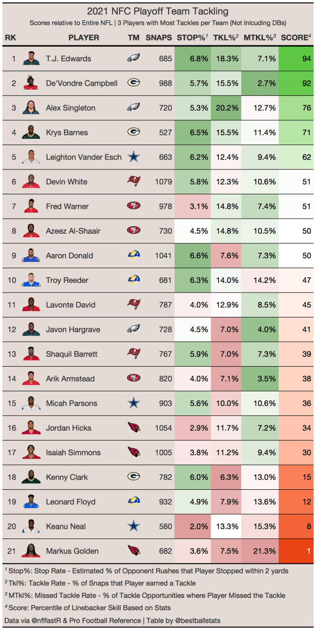 The Eagles are not usually known for having good linebackers, but both Alex Singleton and TJ Edwards have performed better than expected this season, both posting high tackle rates. The Packers also have good linebackers, led by De’Vondre Campbell, who simply does not miss tackles. The best run stopper in the NFC is DJ Jones of the 49ers, who is not pictured in the table above. While DJ Jones does not qualify for the pass rushing table because he does not get a lot of pressures and doesn’t qualifying for the tackling table because he doesn’t have a lot of tackles, he stuffs a run on over 12% of opponent rushing plays. In fact, 26 of DJ Jones’ 39 tackles on the season have come from run stops. The Cowboys and Ezekiel Elliot will have a hard time running up the middle against DJ Jones if he is in the game.