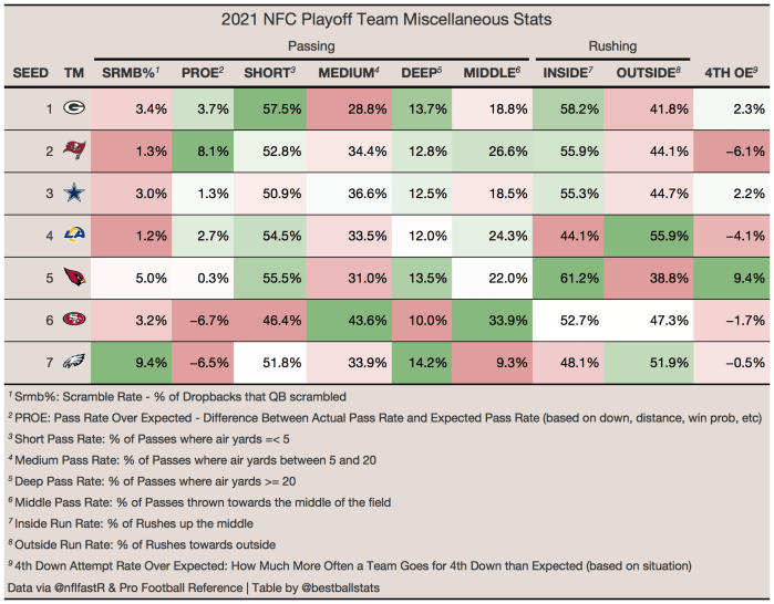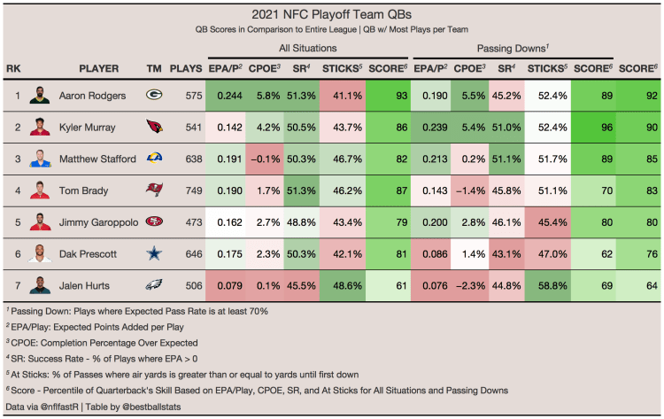 The NFC, meanwhile, is led by likely MVP Aaron Rodgers, who is ranked near the top in all of the efficiency metrics. Kyler Murray is very good in general, but he especially impresses in passing situations. When the Cardinals need a big play in a disadvantageous spot, they can count on Murray. However, Dak Prescott is the opposite as he is better in non-passing situations. Jalen Hurts is the lowest ranked quarterback in most efficiency metrics, putting the Eagles at a disadvantage. But he can help the Eagles in another way: aggressiveness. Hurts is the most aggressive passer in the playoffs, ranking first in Sticks%. If Hurts gets hot and maintains his high level of aggressiveness, the Eagles could benefit from their high variance and upset the Buccaneers (although it is very unlikely). It is better for a bad team to have an aggressive passing attack because it allows for their offensive performance to have a greater variance, meaning they have a higher chance to boom or bust rather than be average. An the Eagles need a boom in order to win their wildcard game.