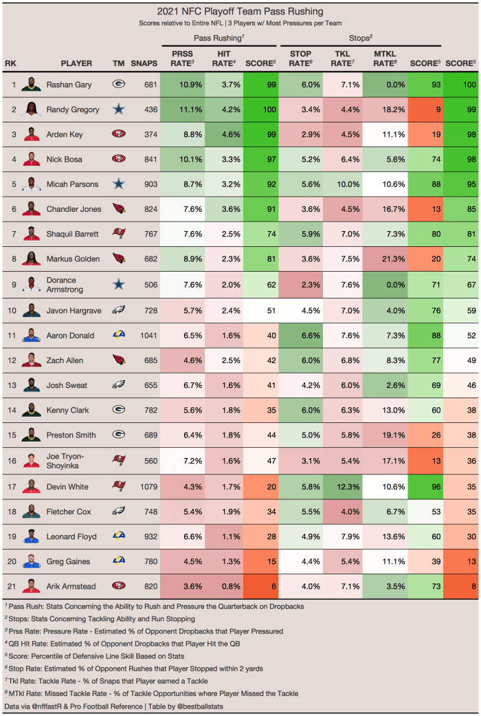 The Dallas Cowboys’ pass rush is their strongest part of their defense. Their top 3 pass rushers — Micah Parsons, Randy Gregory, and Dorace Armstrong — each have pressure rates above 7.5%. The Cardinals also have a strong pass rush, led by Chander Jones. They will face the NFL’s top pass blocking offensive line (according to ESPN’s pass block win rate) in one of the most interesting matchups of the wildcard round. One of the biggest breakouts of the NFL season was Rashan Gary, the Packers outside linebacker. His pass rushing and tackling ability has kept the Packers’ defense afloat as their sack leader from 2020, Za’Darius Smith, was out for most of the season.
