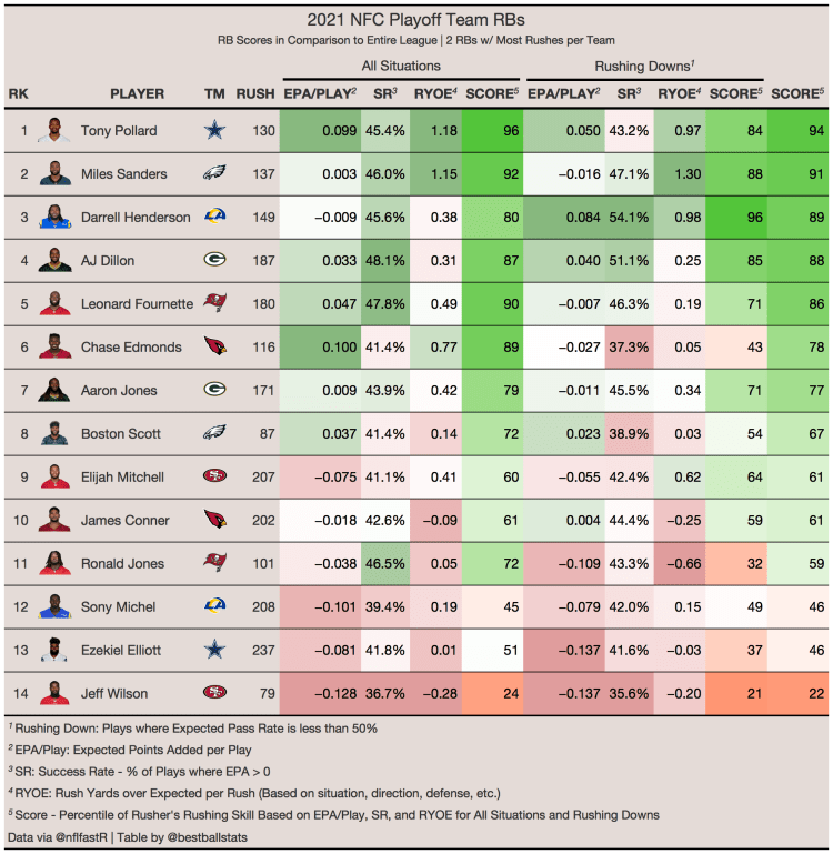 The NFC Playoffs are filled with efficient running backs. Tony Pollard, who is actually far more efficient than Ezekiel Elliot in both traditional stats (5.5 yds per carry vs 4.2 yds per carry for Zeke) and advanced stats, leads the way for the NFC. Miles Sanders has taken advantage of a strong Eagles’ offensive line, gaining over 1.0 average rush yards over expected. While Cardinals running back Chase Edmonds may seem like one of the best running backs according to yards per carry (8th in NFL among qualifying players), he is actually just doing well when the expected pass rate is high, meaning defenses will have fewer players in the box dedicated to stopping the run.