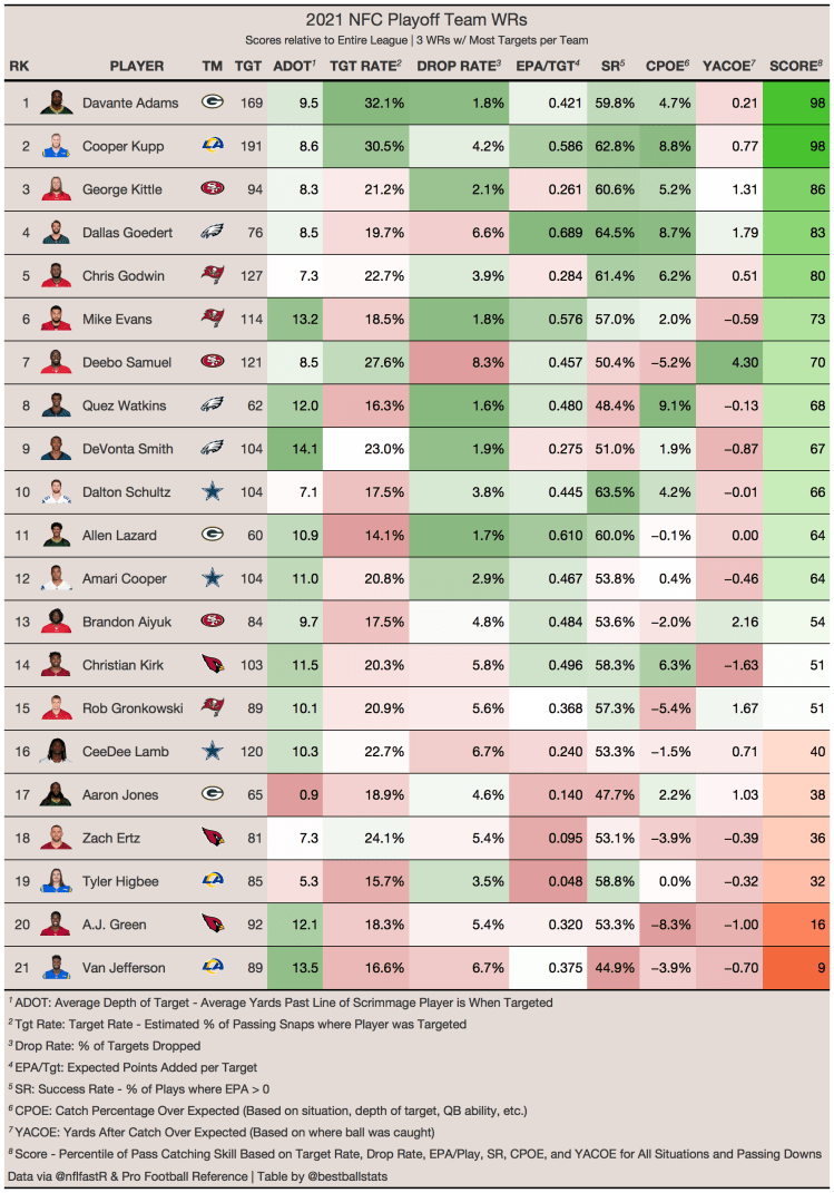 Davante Adams and Cooper Kupp, two NFL Offensive Player of the Year candidates, are a significant reason for their teams’ success. Adams has only 3 drops on the season, almost a 60% success rate, and is targeted on over 30% of Aaron Rodgers’ passes. Kupp, meanwhile, is a reliable option for Matthew Stafford in the slot, posting a catch percentage over expected of almost 9%. The Buccaneers will sorely miss Chris Godwin in the playoffs as he has been ruled out for the season. The 49ers are the best team after the catch, with all three of their top targeted players having a YACOE of at least 1.0. Deebo Samuel, their leading receiver, is another boom or bust player, in that he drops a lot of passes and he catches fewer balls than expected but is extremely explosive after the catch.