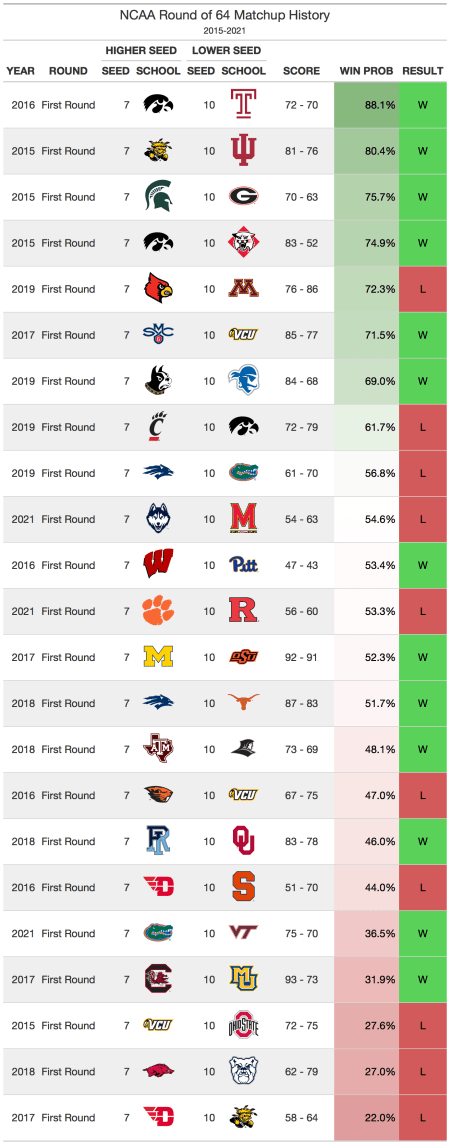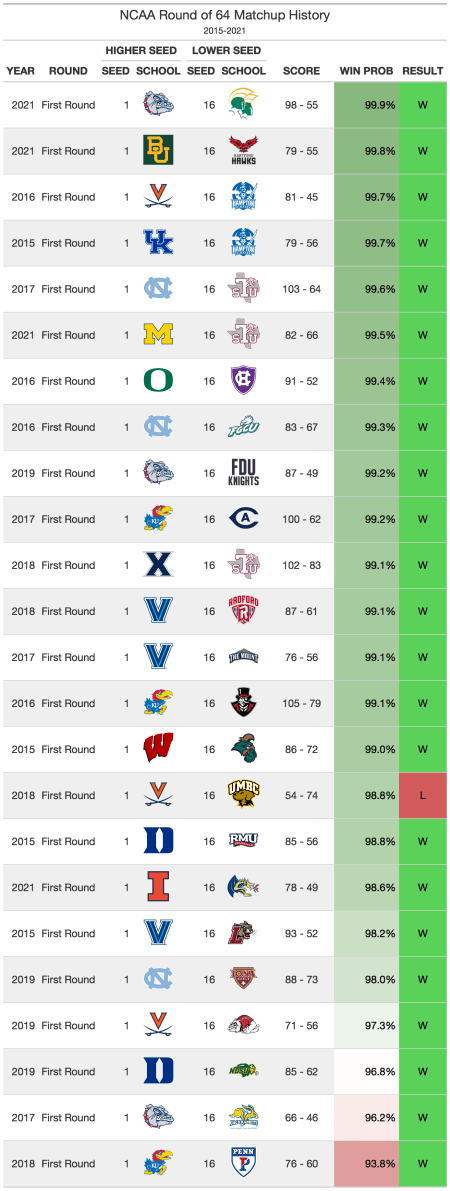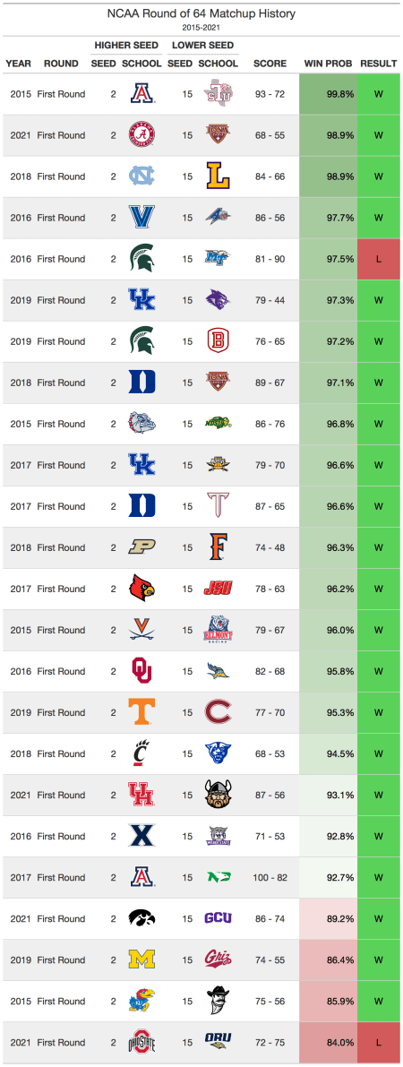 Every year, the 1 and 2 seeds in the tournament usually win their first round matchups. There are some anomalies, such as UMBC’s win over Virginia, MTSU’s win over Michigan State, and Oral Roberts’ win over Ohio State, but it is still very rare. When making brackets, it is best to avoid any upset picks for these types of matchups.