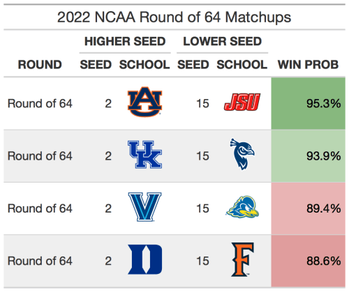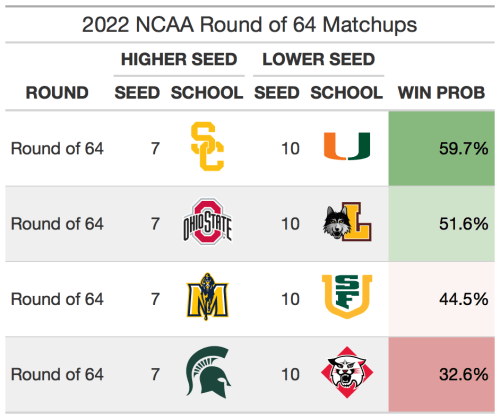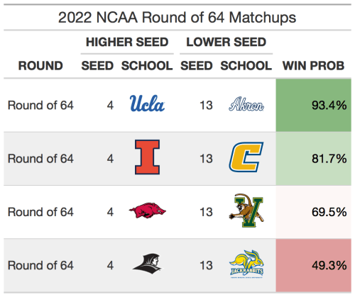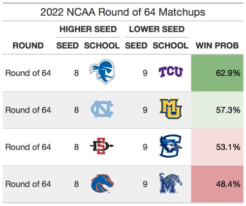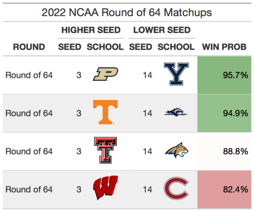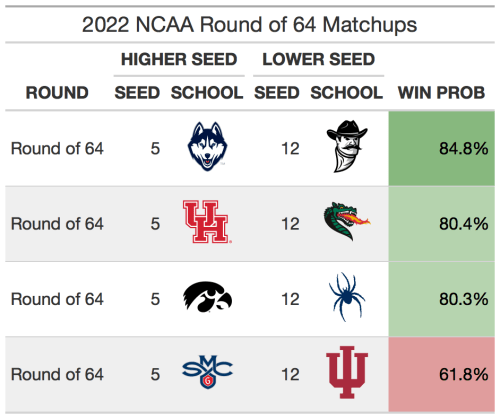 The 5 vs 12 matchups in the tournament are always popular upset picks. 5 seeds have won in the first round just 65% of the time, so there are usually 1 or 2 of them that get upset per year. This year, however, I don’t think there will be many 5 seeds losing in the first round. This year’s crop of 5 seeds are strong, with each ranking inside the top 17 of SABER (Houston is 4th, Iowa is 11th, UConn is 14th, and Saint Mary’s is 17th). If there is one upset candidate, it would be Indiana over Saint Mary’s. Saint Mary’s has about a 60% chance to beat Indiana, similar to Marquette’s chances against Murray State in 2019 and Minnesota’s probability vs MTSU in 2017 (both lost).