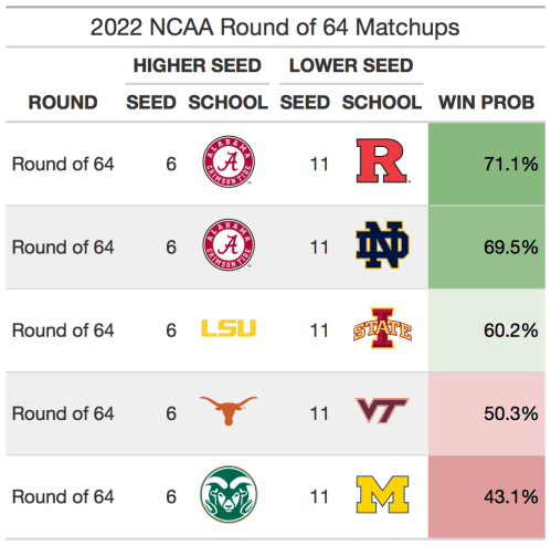 Lately, the 6 vs 11 matchups have been pretty random. The 6 seed has gone just 11-13 against 11 seeds over the past 6 tournaments. The trend should continue this year. While Alabama looks safe to win in the first round, each of LSU, Texas, and Colorado State are on upset alert. In fact, Texas ranks just one spot ahead of Virginia Tech in SABER (22nd and 23rd) while Colorado State is ranked 20 spots lower than Michigan! (48th and 28th) When making a bracket, I would suggest picking Michigan and Virginia Tech to advance as lower seeds.