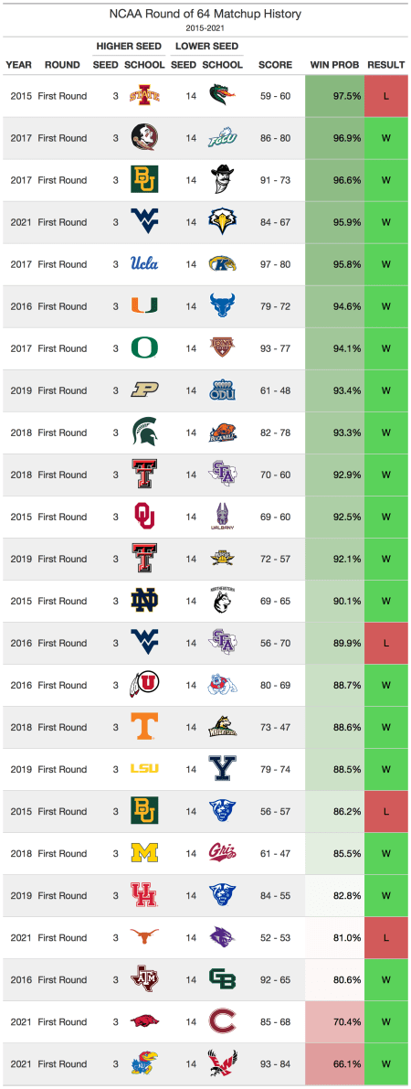 Using SABER ratings can help a little bit in the 3-14 matchups. Using past data, if a 3 seed has less than a 90% chance to win, they are in a little bit of danger. SFA in 2016, Georgia State in 2015, and Abilene Christian in 2021 all had a win probability greater than 10%. This year, Colgate is the most dangerous 14 seed, as Wisconsin ranks 41st in SABER despite being a 3 seed. Wisconsin is very overseeded, and if Colgate gets hot with their shooting, they could cause an upset.