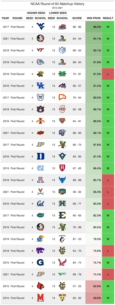 The 3-14 and 4-13 matchups in the first round tend to have some more upsets. The 3 seed has won 85% of first round matchups and the 4 seed has won 78% of first round matchups, so these teams are still very likely to win. On average, there will likely be one or two 3 or 4 seeds that lose in the first round each year. Last year, 4 seed Purdue lost to 13 seed North Texas and 3 seed Texas lost to 14 seed Abilene Christian.